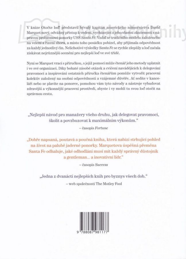 Nyní se Marquet vrací s příručkou, s jejíž pomocí může čtenář jeho metody uplatnit i ve své organizaci. Příručka čtenářům díky bohaté zásobě otázek a cvičení navádějících k delegování pravomocí a inspirování ostatních pomůže vytvořit pracovní kolektiv založený na osobní odpovědnosti a vzájemné důvěře. Ať sedíte v kanceláři nebo se plavíte na ponorce, pomohou vám tyto návody a nástroje vybudovat zdravější a výkonnější pracovní prostředí, abyste i vy mohli tu svou loď otočit na správnou cestu.