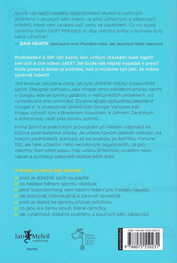 Kniha Sprint je praktickým průvodcem při hledání odpovědí na klíčové podnikatelské otázky. Je určena týmům jakékoli velikosti, od malých podnikatelů, startupů až po podniky z žebříčku Fortune 100, ale také učitelům nebo neziskovým organizacím. Je pro všechny, kteří před sebou mají velkou příležitost, problém nebo nápad a potřebují odpověď nejlépe ještě dnes.